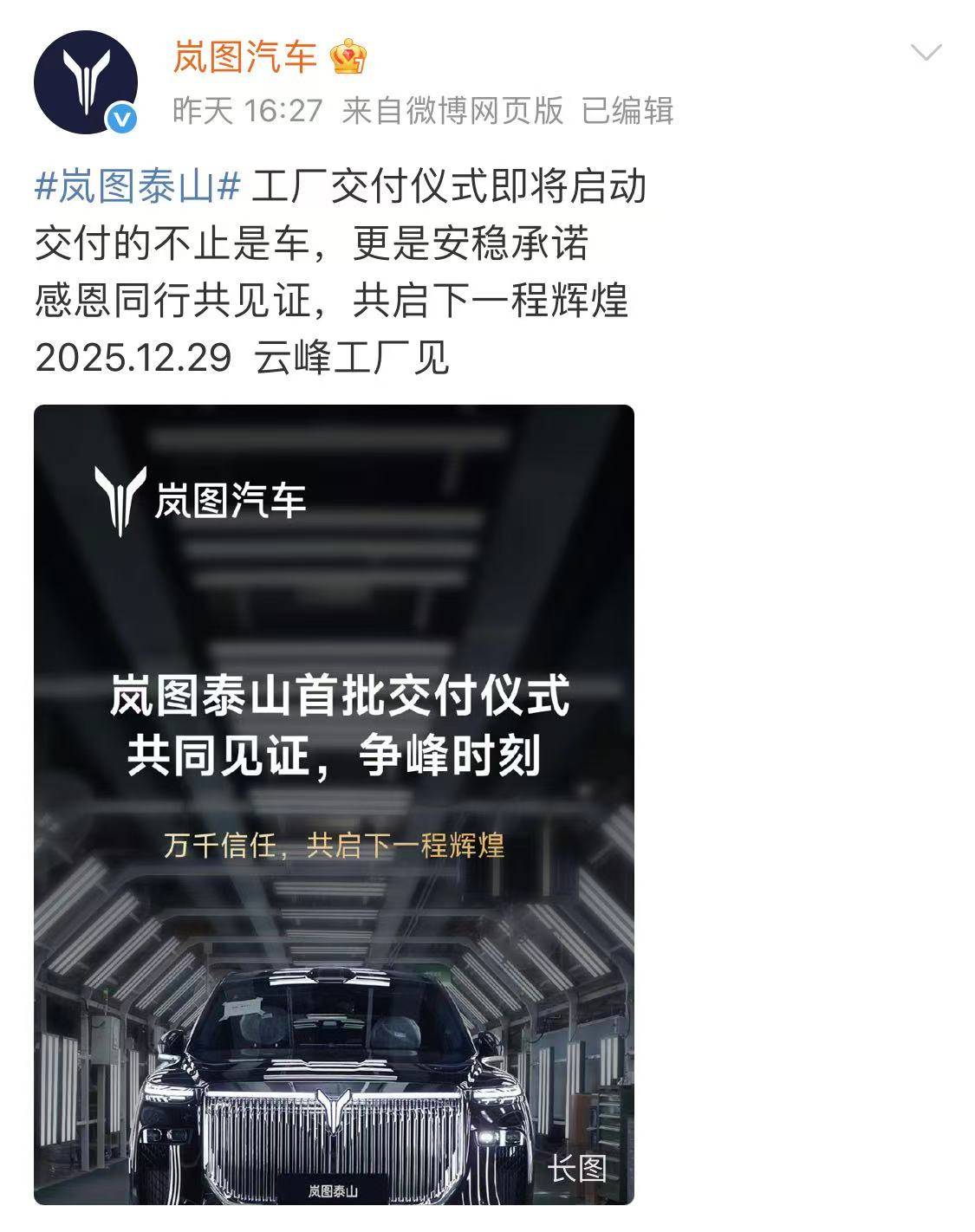 将于12月29日敞开第一批交给。作为岚图品牌旗下的大型SUV,岚图泰山全系搭载1.5T插混+双电机四驱体系,已于11月18日完结上市,官方辅导价格的规模为37.99万-50.99万元。